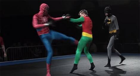 After dispatching of Boy Wonder, Spider-Man sets his sights on Batman who decides to show off his aerobatic side with cartwheels and forward rolls.