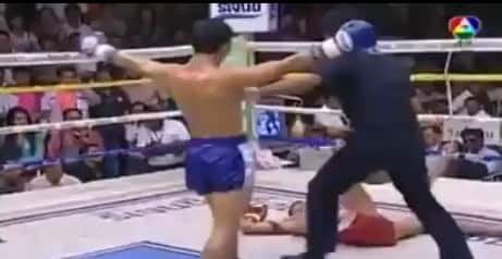 In this fight, over and again a fighter is knocked down, but he keeps standing, and then …