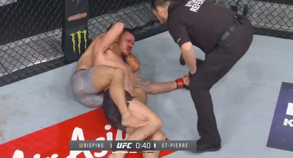 Round 3 – St-Pierre in early on a single-leg and gets the takedown. Bisping resists but settles to full guard. Bisping looks to control the wrists. St-Pierre trying to pass the guard, but Bisping keeping things tight. Punches traded. Bisping frames the face and lands an elbow, cutting St-Pierre. Blood flowing freely, and Bisping finally turns and pushes back to the feet. Right hand lands for Bisping. St-Pierre’s face covered in blood. Bisping looking to take advantage on the feet. St-Pierre managing offense, but he’s certainly slowed a bit. St-Pierre kicks the legs. He land a left hand, and Bisping hits the floor. St-Pierre looking to finish. Bisping is hurt, but he’s battling. Referee John McCarthy watching close. Bisping trying to buy time. He moves back and forth, trying to keep St-Pierre away. Finally, Bisping turns to try and escape. St-Pierre leaps on his back, instantly locking in the choke. He squeezes hard. Bisping won’t give up. The choke is tight, and Bisping goes to sleep. Incredible.