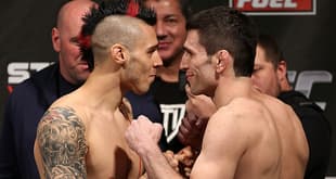 In the deciding third frame, both fighters came out active and traded solid shots. But Hardy again forced the fight to the mat with a trip-takedown, dodged submissions as his opponent was pinned against the cage, and then opened some facial lacerations with elbows from the top. A badly bleeding Sadollah briefly got to his feet before the fight ended, but he ate some additional punches for his efforts.