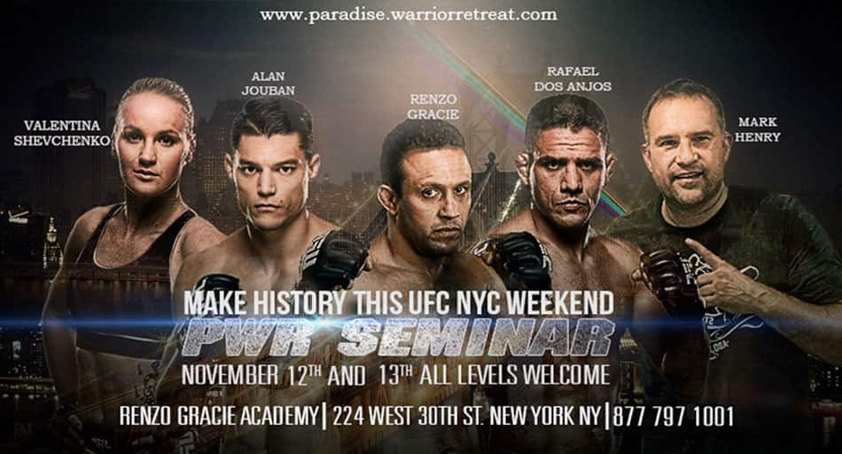 The world famous Paradise Warrior Retreat heads to New York City for the historic UFC 205 weekend. As the Ultimate Fighting Championship makes history with the first professional MMA event in the state of New York YOU can be a part of history too with the Paradise Warrior Retreat Mega Seminar. The training event features Renzo Gracie, Rafael dos Anjos, Valentina Shevchenko, Alan Jouban, and Mark Henry.