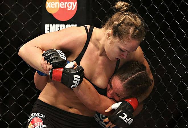 And inside the Octagon, Rousey’s boob issues go deeper than the cotton-Lycra blend. “The bigger my chest is, the more it gets in the way,” says Rousey. When she’s fighting at her most curvaceous weight, “it just creates space. It makes me much more efficient if I don’t have so much in the way between me and my opponent.”