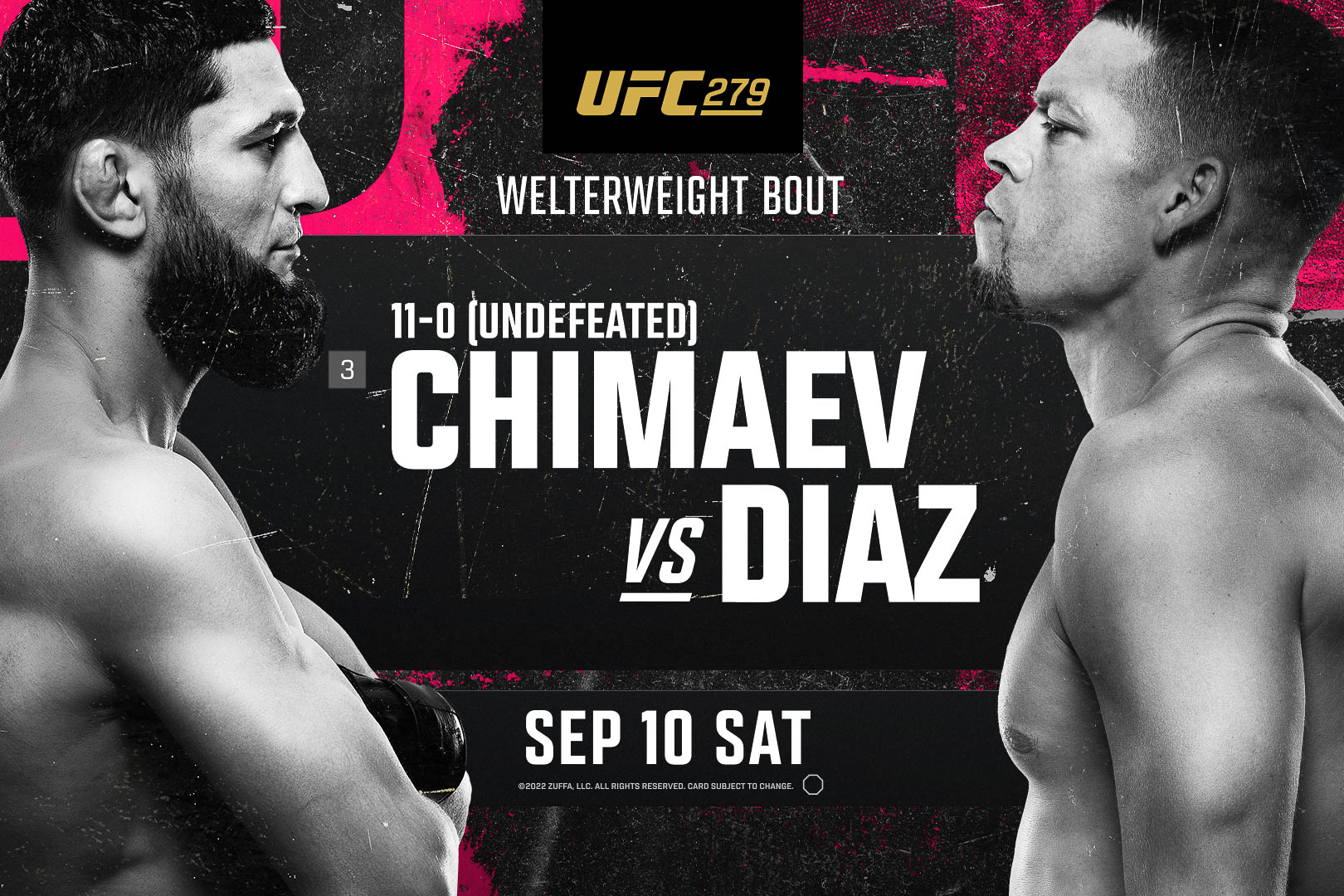 Rising welterweight star Khamzat Chimaev (11-0 MMA, 5-0 UFC) puts his unbeaten record on the line against professional plan-disruptor Nate Diaz (20-13 MMA, 15-11 UFC) in what is a wildly intriguing, five-round main event clash to close out the show.