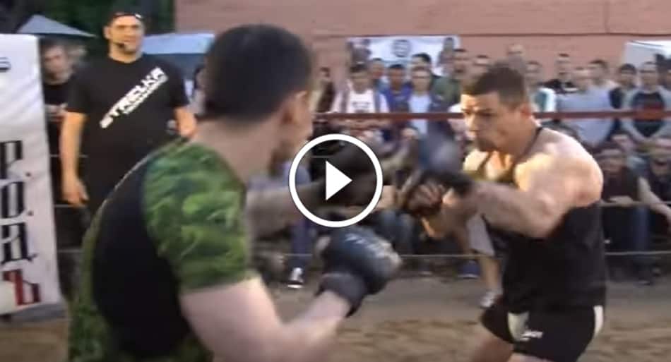 In this video from Russian amateur MMA promotion ‘Arrows Street Fight,’ we see what happens when a bodybuilder fights an MMA fighter who is quite a bit smaller than himself.