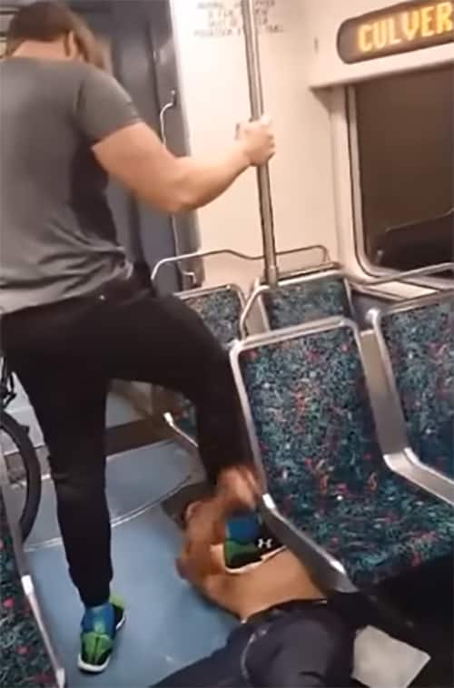After repeatedly antagonizing a fellow subway patron, the shirtless male attempts to strike him. Thankfully, the passenger uses his bike to block the strikes, but that’s exactly when the rowdy bully decides to turn his attention to another subway passenger who calls him a weirdo as he walks by.